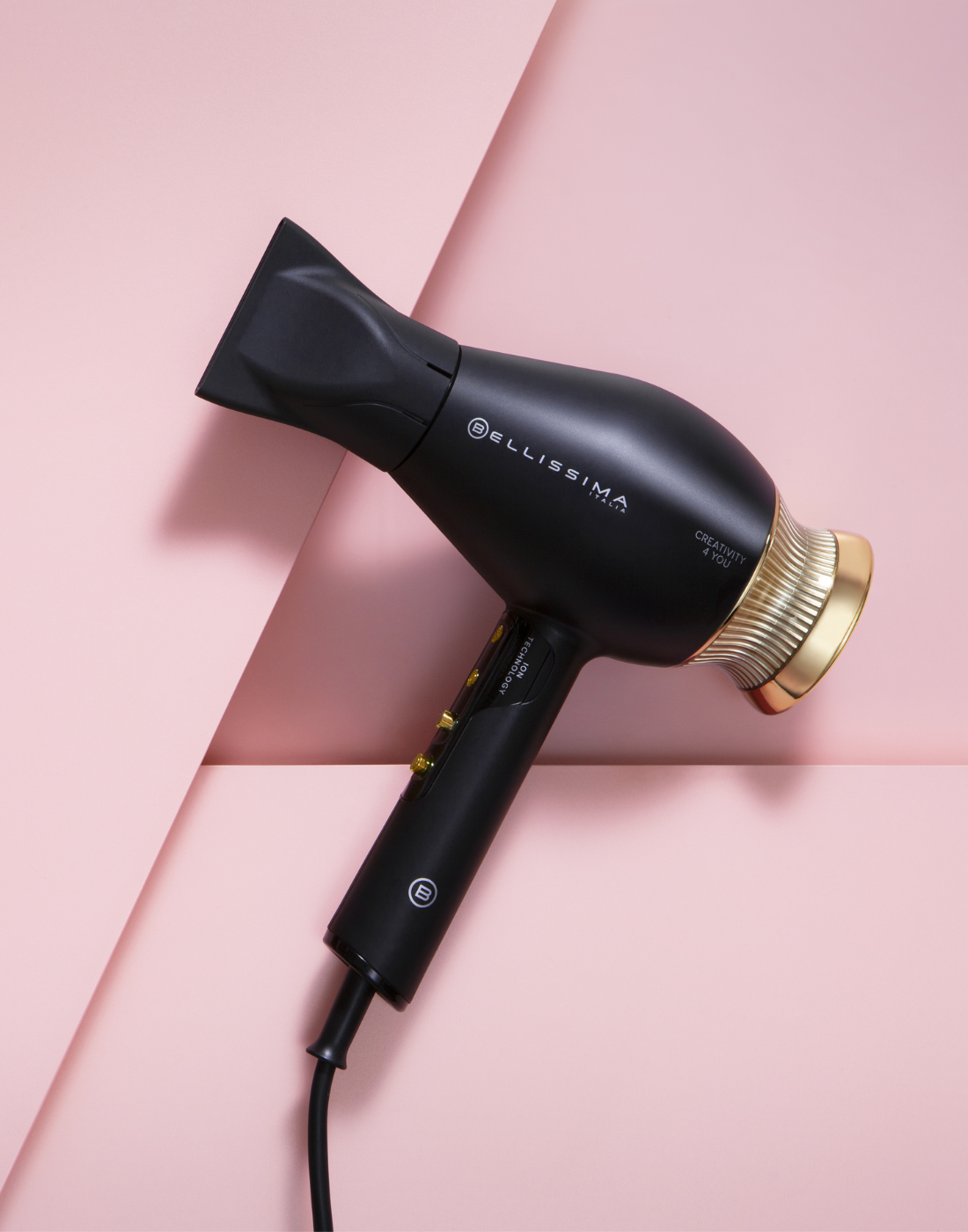 Side view of the Bellissima Travel Hair DryerBellissima B Travel hair dryer against a pink background
